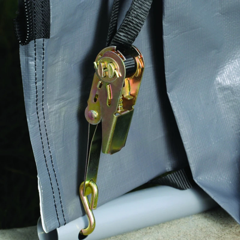 L’accès se fait par une large porte à glissières de 160x180cm qui peut être maintenue ouverte. La paroi arrière est renforcée, et la bâche est solidement fixée à l’armature au moyen de 8 sangles d’arrimage avec tendeurs à cliquet. L’ancrage au sol est assuré par 4 piquets de 38cm de long.