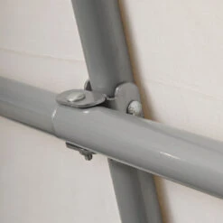 L’accès se fait par une large porte à glissières de 260x210cm qui peut être maintenue ouverte. La paroi arrière est renforcée, et la bâche est solidement fixée à l’armature au moyen de 8 sangles d’arrimage avec tendeurs à cliquet. L’ancrage au sol est assuré par 4 piquets de 38cm de long.