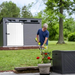 Pour un gain de place maximal, l’abri de jardin en polyéthylène 7,30m² Modern est équipé d’une porte coulissante de type industrielle. Cadenassable (cadenas non fourni) et épaisse de 35mm elle offre un accès facile et met votre contenu en toute sécurité.