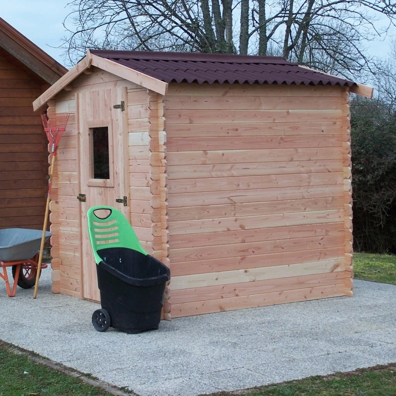 • Abri en bois de belle finition, aspect brun-rosé, naturellement durable, ne nécessitant pas de traitement chimique