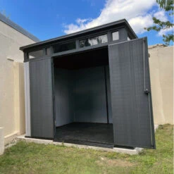 La double porte de 138,8x181cm est pourvue d’un dispositif de verrouillage en acier inoxydable pour une sécurité accrue. La toiture est une imitation 3D de tuiles particulièrement réaliste, et l’abri est garanti 10 ans.