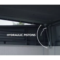 Le nouveau coffre d’extérieur Brossium de Keter est une option qualitative, économique et esthétique pour votre jardin. Sa capacité de stockage de 1150L offre de nombreuses possibilités d’aménagement intérieur (ses parois doubles et résistantes vous permettront de fixer des étagères si vous en avez envie), et même de stockage de poubelles, puisqu’il pourra accueillir 2 containers. Des chaînettes sont prévues pour soulever automatiquement les couvercles des containers à poubelles lorsque vous ouvrirez le capot du coffre Keter. D’ailleurs, l’ouverture du couvercle du coffre de jardin est soulagée par des vérins hydrauliques très performants.