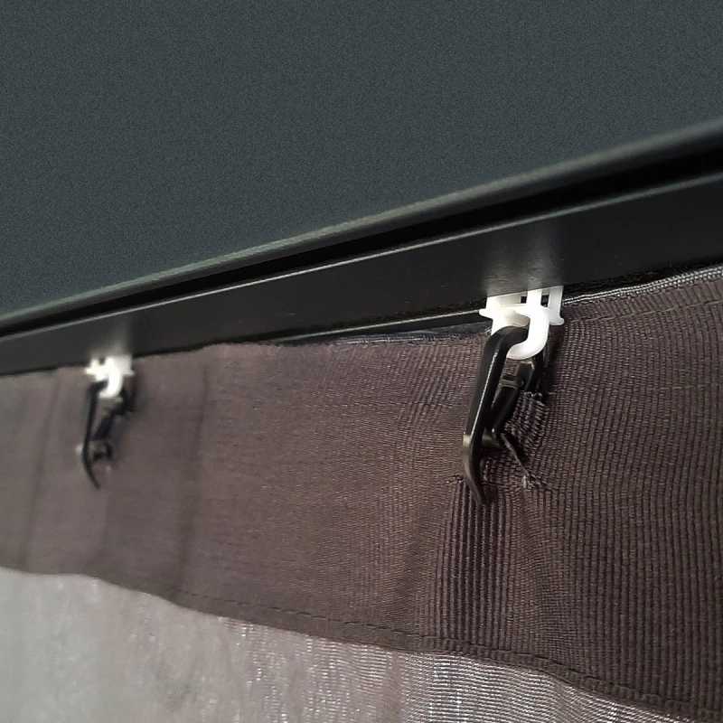 Les rideaux sont livrés avec des crochets coulissants à fixer sur les rails existants dans la structure de la tonnelle. Leur installation est simple et rapide, un pan de rideau couvre une demi-longueur ainsi qu’une demi-largeur. Ils sont fixés au poteau d’angle, et peuvent être maintenus attachés au poteau d’angle au moyen d’embrasses munies de velcro.