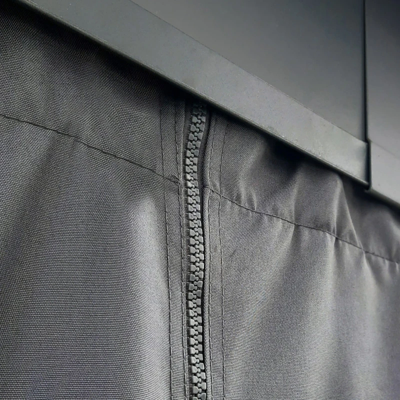 Les rideaux sont pourvus de fermetures éclair pour les unir et assurer une continuité de la tenture. Les rideaux peuvent être ouverts ou fermés selon différentes configurations, pour disposer par exemple de deux parois pleines qui font face à vos vis-à-vis et de deux parois ouvertes sur votre aménagement extérieur. Ces rideaux vous procureront une intimité totale et créeront une ambiance feutrée et chaleureuse, en fonction de vos envies.