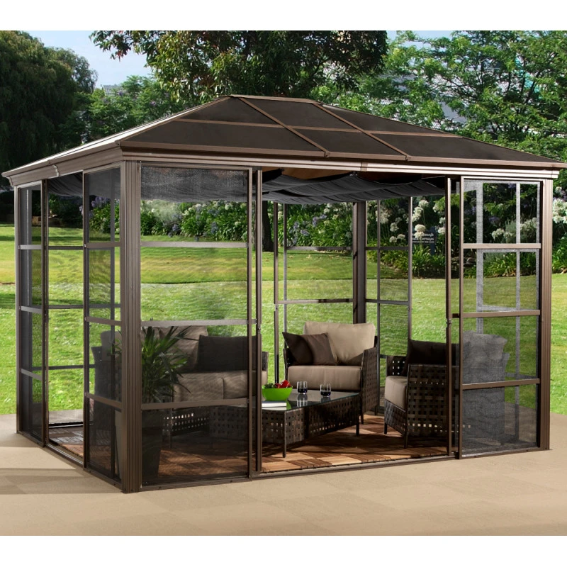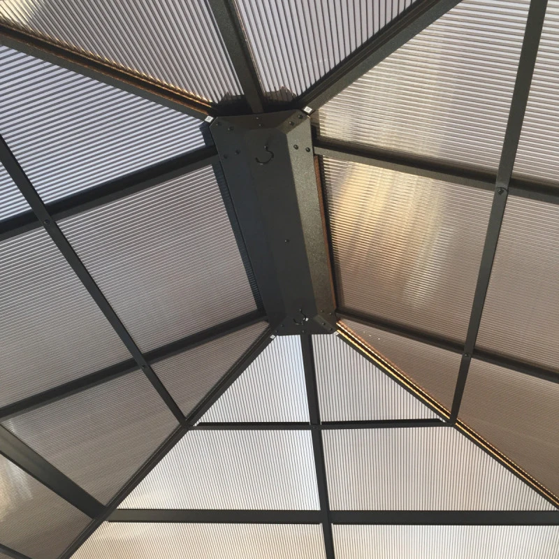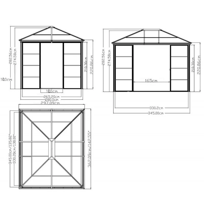 Chaque côté du pavillon comprend une double porte moustiquaire coulissante, de dimensions 100x210cm pour les largeurs et 165x210cm pour les longueurs. L’emprise de la toiture est de 362x298cm avec une hauteur faîtière de 283cm. Grâce à la toiture en polycarbonate 8mm, vous pourrez cultiver des plantes sensibles et profiter des rayons du soleil pour vous réchauffer aux entre saisons. Et lorsque le soleil est trop fort, un store rétractable vous assurera un ombrage rafraichissant. Le store se compose de 2 parties qui se joignent à la main au moyen d’un clip, en toute simplicité. Le montage doit se faire sur une surface plane, il se réalise facilement au moyen d’un outillage standard à 2 personnes en environ 5 à 6 heures.