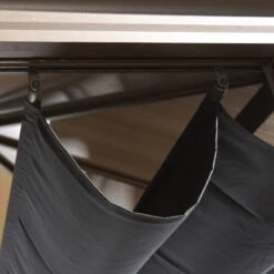 Les poteaux sont munis de 3 trous pré-percés pour leur fixation, la visserie d’ancrage n’est pas fournie car elle dépend du support, qui peut être une dalle de béton, du dallage ou une terrasse en bois. Ce modèle est conçu pour résister à une charge de neige de 125kg/m² et ne craint pas la corrosion. La visserie de montage incluse est intégralement en acier inoxydable, ce pavillon ne devra donc pas être démonté pendant la saison hivernale. Deux crochets de fixation multi usage présents sur la barre faîtière permettent l’accrochage d’un système lumineux ou de jardinières suspendues.