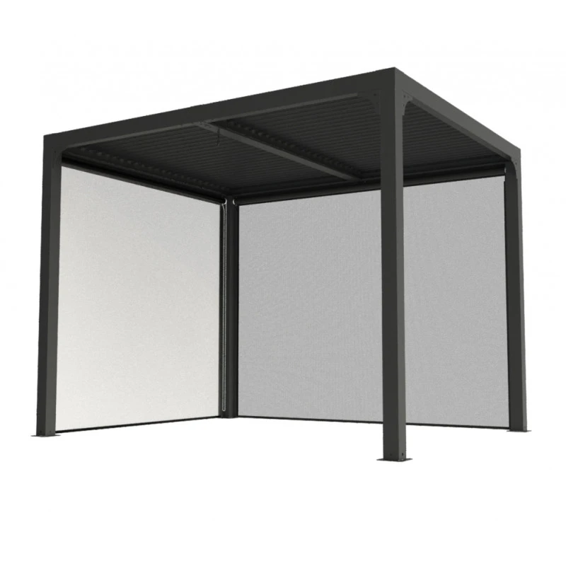 Produit de haute qualité, la pergola bioclimatique 7,20m² Habrita est réalisée en aluminium qui est un matériau léger, robuste et durable. Il résiste bien aux intempéries et à la corrosion et ne demande aucun entretien spécifique. Les lames ovales de toit, également en aluminium, sont orientables ce qui vous permettra de réguler vous-mêmes la lumière pénétrante sous le toit de pergola. Pour votre plus grand confort, les deux rideaux en PVC tissé 430gr/m² sont réglables en hauteur à l’aide d’un mécanisme manuel. Le système de guidage fixé aux poteaux opposés vous garantit une meilleure stabilité au cas du vent.