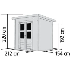 L’abri de jardin en bois Merseburg 3 a deux portes battantes, aménagées de fenêtres en plexiglas et de moraillon de sécurité qui séduisent par la simplicité de leur design. Le toit une pente est fait de voliges, épaisses de 16mm qui peuvent être recouvertes d’un feutre bitumé (en option). Le toit peut être allongé à gauche ou à droite grâce à la toiture d’extension, pour la réalisation d’un bûcher par exemple