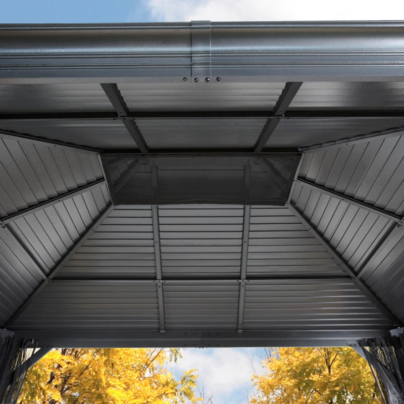 Cette pergola est dotée d’une toiture solide constituée de tôles en acier galvanisé aux rayures horizontales, rappelant un agencement harmonieux d’ardoises de la même couleur que la structure. Ce produit de grande qualité vous est proposé par le spécialiste canadien des constructions de jardin, Sojag. Habitués des conditions climatiques sévères, tous leurs abris sont conçus pour résister durablement aux intempéries : neige, pluie ou soleil. La toiture peut soutenir une charge de neige impressionnante de 150kg/m² et le revêtement par thermolaquage ainsi que la toiture galvanisée ne craignent aucunement la corrosion.